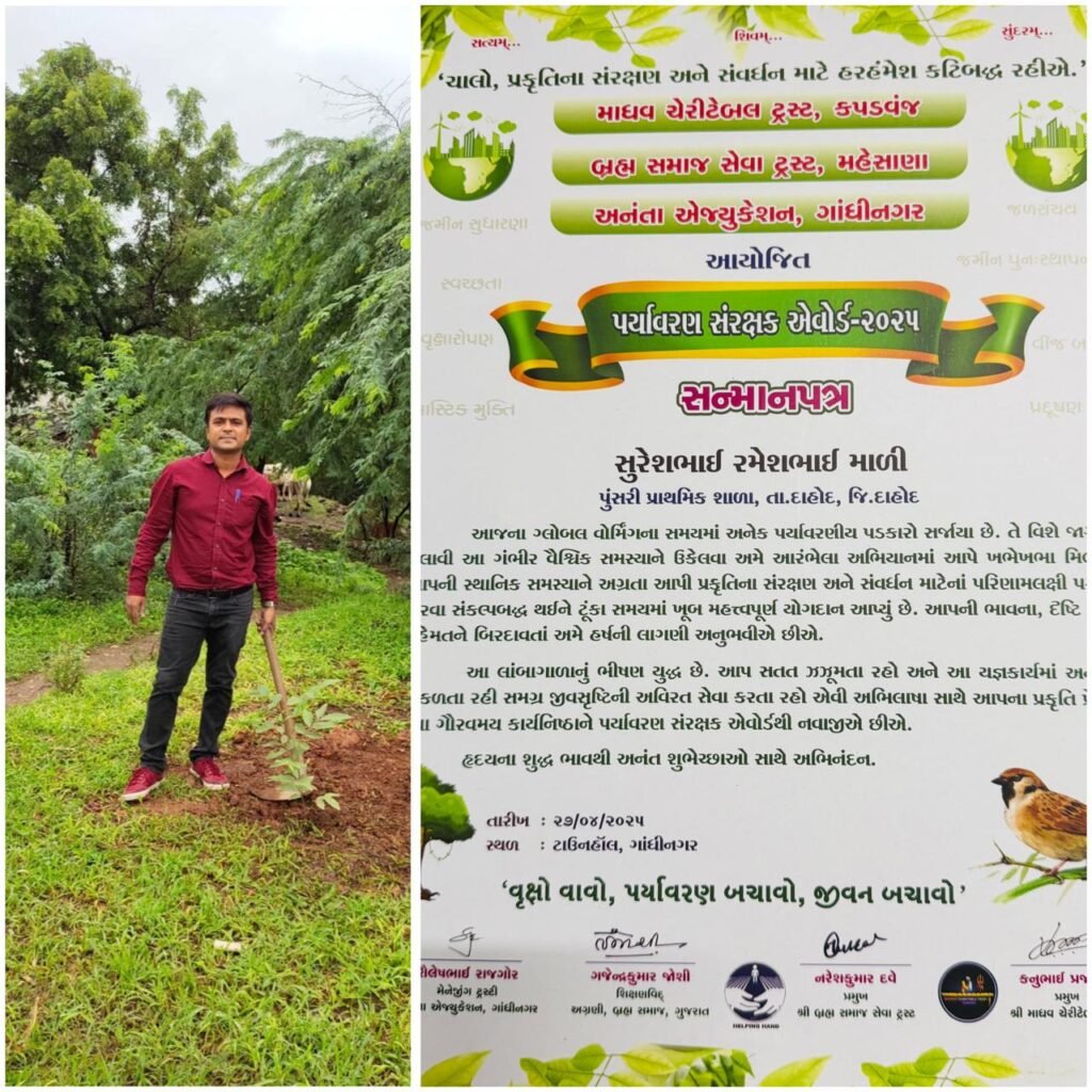 પુંસરી પ્રાથમિક શાળાનાં શિક્ષક સુરેશ માળી પર્યાવરણ સંરક્ષણ એવોર્ડથી સન્માનિત