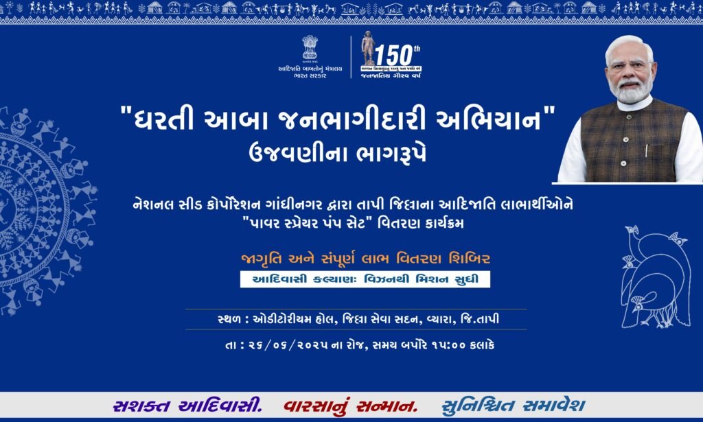 (પ્રતિનિધિ દ્વારા, વ્યારા) : ૨૫ જૂન:. “ધરતી આબા જનભાગીદારી અભિયાન” ના ઉજવણીના ભાગરૂપે આજે ૨૬ જૂન, ૨૦૨૫ ના રોજ બપોરે ૩ કલાકે તાપી જિલ્લા ઓડિટોરિયમ હોલ,વ્યારા ખાતે રાજ્યના વન અને પર્યાવરણ મંત્રીશ્રી મુકેશભાઈ પટેલના અધ્યક્ષસ્થાને સાધન સહાય વિતરણ કાર્યક્રમનું આયોજન કરાયું છે.