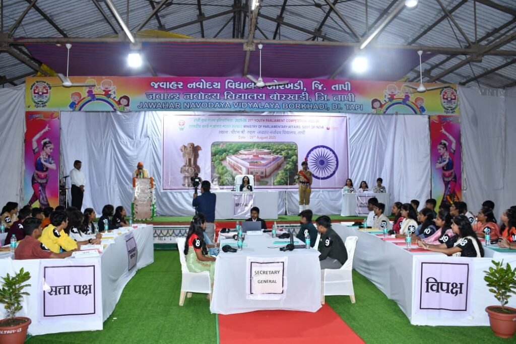 (પ્રતિનિધિ દ્વારા, વ્યારા) : તાપી જિલ્લાની જવાહર નવોદય વિદ્યાલય બોરખડી ખાતે આજે યુથ પાર્લામેન્ટનું આયોજન કરવામાં આવ્યું હતું. સંસદની પ્રક્રિયાને વિદ્યાર્થીઓ સુધી પહોંચાડવા અને તેમના વ્યક્તિત્વમાં નેતૃત્વ, જવાબદારી તથા રાજકીય જાગૃતિ વિકસાવવા માટે આ કાર્યક્રમ મહત્વપૂર્ણ સાબિત થયો હતો.
