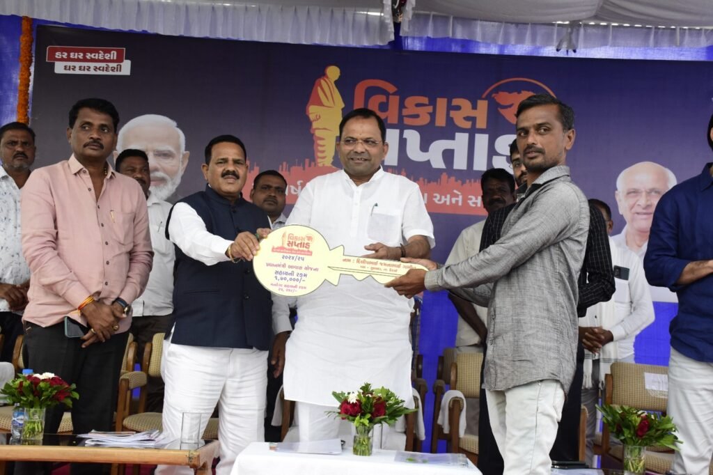 વિકાસ સપ્તાહ અંતર્ગત ઉકાઈ ખાતે આયોજિત કાર્યક્રમ દરમિયાન વન અને પર્યાવરણ મંત્રીશ્રી મુકેશ પટેલના હસ્તે દિલીપભાઈએ પોતાના નવા આવાસની પ્રતિકાત્મક ચાવી મેળવી. તે ક્ષણે તેમની આંખોમાં આનંદના આંસુ અને મનમાં સંતોષની લાગણી છલકાઈ રહી હતી.