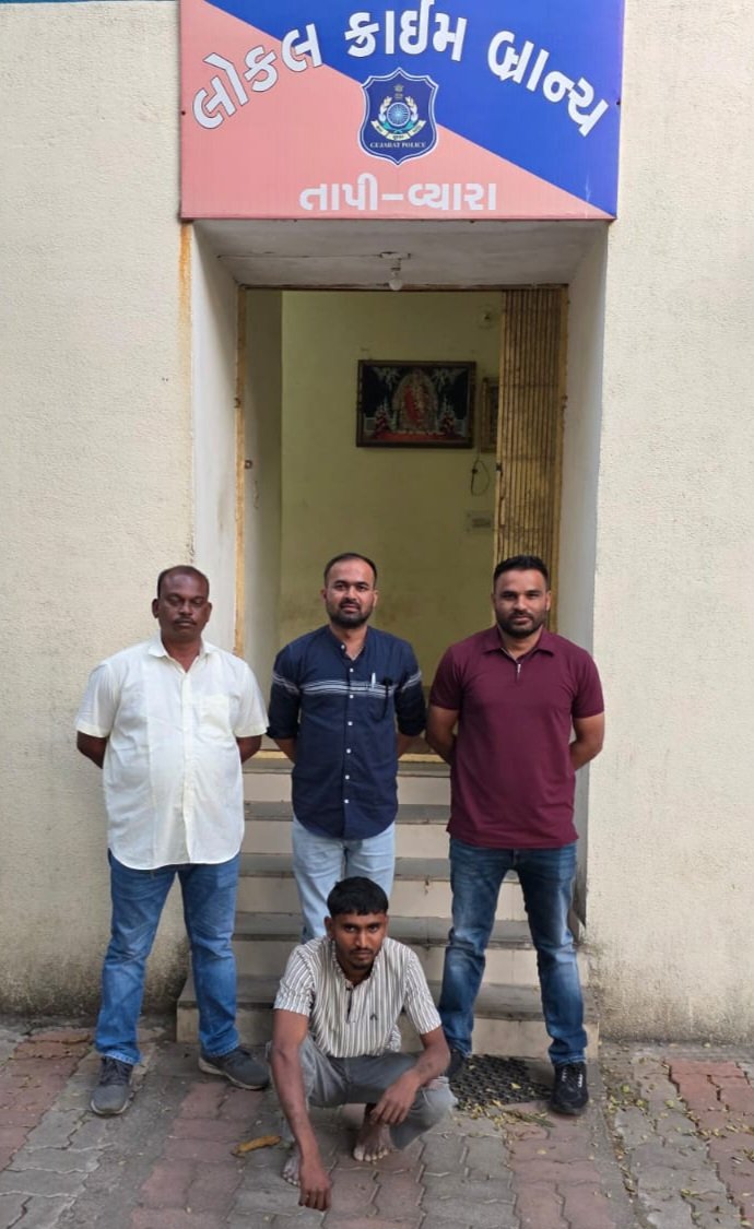 (પ્રતિનિધિ દ્વારા, વ્યારા) : ગઇ કાલ તા.૧૫/૧૨/૨૦૨૫ ના રોજ શ્રી ડી.એસ. ગોહિલ, શ્રી એન.જી. પાંચાણી પોલીસ ઈન્સ્પેકટર, એલ.સી.બી. તાપીની સીધી સુચના અને માર્ગદર્શન હેઠળ પો.સ.ઇ.શ્રી એન.એસ. વસાવા, પેરોલ- ફર્લો સ્કોર્ડ તાપી, એલ.સી.બી./ પેરોલ-ફર્લો સ્કોર્ડ તાપીના માણસો સાથે વ્યારા પોલીસ સ્ટેશનના વાહન ચોરીનાં છ ગુનાના કામે સંડોવાયેલ આરોપીઓ તથા ચોર મુદ્દામાલ શોધી કાઢવા તપાસ તજવીજ ચાલુ હતી. દરમ્યાન સાથેના એ.એસ.આઇ. ધર્મેશભાઇ મગનભાઇ અને પો.કો. રોનકભાઈ સ્ટીવનસનને ખાનગી રાહે બાતમી હકીકત મળેલ કે, આ ગુનાના નહી પકડાયેલ વોન્ટેડ આરોપી ક્રિષ્ના રઘુનાથ ગાંગુર્ડે રહે.રહે. સાવરપાડા તા.સાક્રી જી.ધુલીયા (મહારાષ્ટ્ર)નનો હાલમાં દહીવેલ (મહા.) ખાતે છે. તેવી બાતમી હકીકત મળતા આ કામે ટેકનિકલ ટીમની મદદથી તેમજ હ્યુમન શોર્શથી જરૂરી તપાસ કરતા આ બાતમી હકીકત સાચી હોય જેથી પો.સ.ઇ.શ્રી, એન.એસ. વસાવા પેરોલ- ફર્લો સ્કોર્ડ, તાપી, એલ.સી.બી./ પેરોલ ફર્લો સ્કોર્ડ તાપીની ટીમ ખાનગી વાહનોમાં આ આરોપીની તપાસ અર્થે દહીવલ મહારાષ્ટ્ર રાજ્ય ખાતે જઇ તપાસ કરતા આ આરોપીને મહારાષ્ટ્ર રાજ્યના દહીવેલ ખાતેથી મળી આવતા પકડાયેલ આરોપી-ક્રિષ્ના રઘુનાથ ગાંગુર્ડે ઉ.વ.૨૪ રહે.રહે.સાવરપાડા તા.સાકી જી.ધુલીયા (મહારાષ્ટ્ર) ને પકડી પાડી પકડાયેલ આરોપીઓને વિશ્વાસમાં લઇ યુક્તિ પ્રયુક્તિથી પુછપરછ કરતા સને ૨૦૨૪ માં વ્યારા ટાઉન વિસ્તારમા રાત્રી દરમ્યાન આવી જુદી જુદી જગ્યાએથી મોટર સાઇકલોની ચોરી કરેલાની કબુલાત કરતો હોય અને વ્યારા પોલીસ સ્ટેશનના વાહન ચોરીના છ ગુનાઓમાં નાસતો ફરતો વોન્ટેડ હોવાનું કબુલાત હોય, પકડાયેલ આરોપીને તા.૧૫/૧૨/૨૦૨૫ ના રોજ પકડી પાડી કાયદેસરની કાર્યવાહી કરી આગળની વધુ કાર્યવાહી સારૂ વ્યારા પોલીસ સ્ટેશન ખાતે સોંપેલ છે.