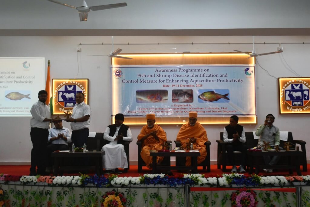 સેન્ટર ઓફ એક્સલન્સ ઇન એક્વાકલ્ચર કામધેનુ યુનિવર્સીટી ઉકાઈ દ્વારા “માછલી અને ઝીંગામાં થતાં રોગોની ઓળખ અને જળચર ઉછેરની ઉત્પાદકતા વધારવા માટે તેમનું નિયંત્રણ અંગે જાગૃતિ કાર્યક્રમ” તારીખ ૨૯-૩૧ ડિસેમ્બર, ૨૦૨૫ ના રોજ યોજવામાં આવેલ છે. આ કાર્યક્રમના ઉદ્ધાટન પ્રસંગે મુખ્ય અતિથિ તરીકે સ્વામીનારાયણ મંદિર ઉકાઈના મહંત સ્વામી દેવરત્નજી મહારાજ અને સ્વામી યોગેશજી મહારાજ સાથે અતિથિ વિશેષશ્રી તરીકે ડૉ. કે. એચ. વાઢેર, આચાર્યશ્રી, મત્સ્યવિજ્ઞાન મહાવિદ્યાલય, કાયુ, નવસારી તેમજ વિષય તજજ્ઞો તરીકે ડૉ. કુંદનકુમાર, વરિષ્ઠ વૈજ્ઞાનાનીક, ડિપાર્ટમેન્ટ ઓફ એકવેટિક ઈન્વાયર્મેન્ટ એન્ડ હેલ્થ મેનેજમેન્ટ, ICAR-CIFE, મુંબઈ તેમજ ડો. સૌરવકુમાર, ICAR-CIFE, મુંબઈ અને ડૉ. એચ. જી. સોલંકી, વડા, મત્સ્યવિજ્ઞાન મહાવિદ્યાલય, કાયુ, હિંમતનગર ઉપસ્થિત રહેલ હતા. આ કાર્યક્રમમાં આવનાર ત્રણ દિવસમાં કામધેનુ યુનિવર્સિટીના વિવિધ તજજ્ઞો ઉપસ્થિત અનુસ્નાતક કક્ષાના વિદ્યાર્થીઓ અને મત્સ્યપાલકોને માર્ગદર્શન આપશે. આ કાર્યક્રમ આયોજન પાછળનો મુખ્ય ઉદેશ જળચર ઉછેર કરતાં સમયે થનાર રોગોની ઓળખાણ સાથે તાત્કાલિક સારવાર અને એનાથી થનાર નુક્શાનને અટકાવ સાથે સાથે ખેડૂતોને આવકમાં વધારો થાય આ દ્રષ્ટિએ મહત્વનું છે. ઉપરોક્ત કાર્યક્રમમાં કુલ ૬૫ સ્નાતક કક્ષાના વિદ્યાર્થીઓ સાથે આ વિસ્તારના ખેડૂતો ઉપસ્થિત રહેલ છે. આ કાર્યક્રમનું આયોજન કામધેનુ યુનિવર્સિટીના માનનીય કુલપતિશ્રી ડો. પી. એચ. ટાંક અને વિસ્તરણ શિક્ષણ નિયામકશ્રી, ડો. જે. એસ. પટેલના માર્ગદર્શનથી કરવામાં આવેલ છે.