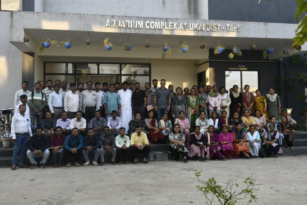 સેન્ટર ઓફ એક્સલન્સ ઈન એકવાકલ્ચર કામઘેનુ યુનિવર્સિટી ઉકાઈ કેન્દ્ર પર સોનગઢ અને ઉકાઈ તાલુકાના કુલ ૧૦૦ જેટલા શિક્ષકો (૬ થી ૮ ધોરણના) પૂર્વ વ્યવસાયિક શિક્ષણ શિક્ષક તાલીમ મોડ્યુલ (મિડલ સ્ટેજ) (૧૦ BAGLESS DAYS) ની તાલીમ અંતર્ગત મુલાકાત લેવામાં આવેલ હતી. મુલાકાત દરમ્યાન શિક્ષકોને સુશોભન માછલીઘર, બોટ મ્યુઝિયમ, ફિશ મ્યુઝિયમ વગેરે નિહાળ્યાં. ડો. સ્મિત લેન્ડે હેડ, સીઓઈ ઉકાઈ દ્વારા શિક્ષકોને જલીય જીવન ઉપર માર્ગદર્શન આપવામાં આવ્યું.