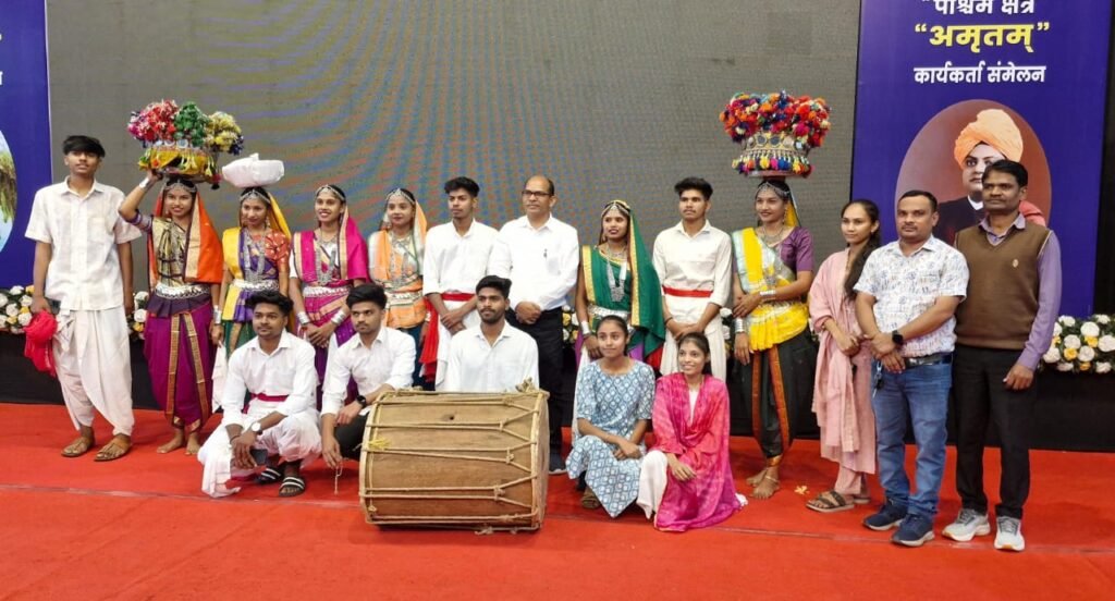 (મુકેશ પાડવી દ્વારા, નિઝર) : ભારત વિકાસ પરિષદ પ્રશ્ચિમ ક્ષેત્ર (ગુજરાત, મહારાષ્ટ્ર અને ગોવા)દ્રારા આયોજિત ‘અમૃત્તમ’ કાર્યકર્તા સંમેલન તા:૦૩ જાન્યુઆરી ૨૦૨૬ના રોજ વીર નર્મદ દક્ષિણ ગુજરાત યુનિવર્સીટી સુરતના કનવેશન હોલ ખાતે યોજવામાં આવ્યું હતું. આ સંમેલનમાં પશ્ચિમ શ્રેત્રના વિવિધ રાજ્યમાંથી આવનાર પ્રતિનિધિઓ દ્રારા વિવિધ સંસ્કૃતિક કાર્યક્રમોની રજુઆત કરવામાં આવી હતી. આ કાર્યક્રમમાં વીર નર્મદ દક્ષિણ ગુજરાત યુનિવર્સીટીના સમાજશાસ્ત્ર વિભાગના વિદ્યાર્થીઓએ વિભાગના પ્રાધ્યાપક ડો. જીતેન્દ્ર વસાવાના માર્ગદર્શન હેઠળ આદિવાસી નૃત્યની અસરકારક રજુવાત કરવામાં આવી હતી. આ નૃત્ય કૃતિમાં આદિવાસી સમુદાયની પરંપરાગત જીવનશૈલીને પ્રતિબિબિત કરતી ખેતી કરવાની પદ્ધતિ, ખેતીના દેવિતાઓનું પૂજન, ઉપજેલા પાકને પ્રકૃતિક દેવો તથા કુળદેવીને અર્પણ કરવાની પરંપરાગત, તેમજ લગ્ન સંસ્કાર જેવી મહત્વપૂર્ણ બાબતોનું ક્લાત્મક રિતે પ્રસ્તુતિકરણ કરવામાં આવ્યું હતું. વિદ્યાર્થીઓએ પરંપરાગત વસ્ત્રો અને ઘરેણાં સાથે ચાંગી ઢોલ, છીબલી (ટોપલી) તથા પ્રકૃતિક અને કુળદેવી યાહામોગીમાતાની પૂજા માટે ઉપયોગમાં લેવાતા હિજારી ખેતીના સાધનોની ઉપયોગ કરીને નૃત્યને વધુ જીવંત અને આકર્ષણ બનાવ્યું હતું. આ પ્રસ્તુતિને કાર્યક્રમના આયોજકો તેમજ ઉપસ્થિત શ્રોતોઓ દ્રારા ખુબ જ પ્રશંસા મળી હતી. શ્રોતોઓએ વિદ્યાર્થીઓ સાથે ફોટોગ્રાફી કરી તથા તેમની સાથે સંવાદ સાઘી આશીર્વાદ આપ્યા હતા. આ સમગ્ર કાર્યક્રમ વીર નર્મદ દક્ષિણ ગુજરાત યુનિવર્સીટીના માનનીય કુલપતિ ડો. કિશોરસિંહ ચાવડા, સમાજશાસ્ત્ર વિભાગના અધ્યક્ષ ડો. એમ. એન. ગાયકવાડ તથા રૂરલ સ્ટડીઝ વિભાગના અધ્યક્ષ ડો. દિપક ભૌયેના માર્ગદર્શન હેઠળ સફળતાપૂર્વક પાર પાડવામાં આવ્યું હતું.