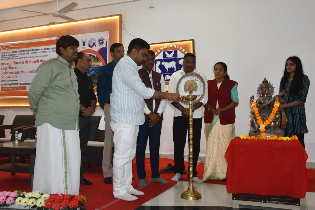 (પ્રતિનિધિ દ્વારા, વ્યારા) : સેન્ટર ઓફ એક્સલન્સ ઇન એક્વાકલ્ચર, કામધેનુ યુનિવર્સિટી, ઉકાઈ ખાતે તારીખ ૦૫ જાન્યુઆરી, ૨૦૨૬ના રોજ સેન્ટર ઓફ એક્સલન્સ ઇન એક્વાકલ્ચર, કામધેનુ યુનિવર્સિટી, ઉકાઈ અને સેન્ટ્રલ ઇન્સ્ટિટ્યૂટ ઓફ ફિશિંગ ટેક્નોલોજીના સંયુક્ત ઉપક્રમે “અનુસૂચિત જાતિ ઉપયોજનાના અંતર્ગત સહાયક વિતરણનું કાર્યક્રમનું” આયોજન કરવામાં આવેલ હતો. આ કાર્યક્રમના ઉદ્ધાટન પ્રસંગે મુખ્ય અતિથિશ્રી તરીકે શ્રી. જાલમસિંહજી વસાવા માન. તાપી જિલ્લા પંચાયત પ્રમુખશ્રી, શ્રી. સુરજભાઈ વસાવા માન. તાપી જિલ્લા ભાજપ પ્રમુખશ્રી સાથે અતિથિ વિશેષશ્રી તરીકે પદ્મશ્રી રમીલાબેન ગામીત, ટાપરવડા, ડો. આશિષકુમાર ઝા, વૈજ્ઞાનિક ICAR CIFT, વેરાવળ, અને પ્રેરક ઉપસ્થિતિ તરીકે શ્રી ભાવિન એમ. ઘેરવાલા, વૈજ્ઞાનિક અબાઈટીક સ્ટ્રેસ મેનેજમેન્ટ ઇન્સ્ટિટ્યૂટ, બારામતી, પૂણે જૂનિયર ટેક્નિકલ ઓફિસર (JTO), MPEDA, SRD, વલસાડ ઉપસ્થિત રહેલ હતા.