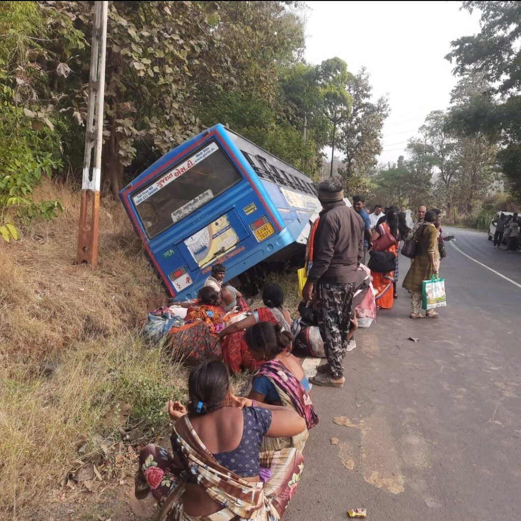 (અર્જુન જાધવ દ્વારા, વધઈ) : ડાંગ જિલ્લાના વઘઇ-આહવા રાજ્ય ધોરીમાર્ગ પર એક ગમખ્વાર અકસ્માત સર્જાયો હતો.ધરમપુરથી આહવા આવતી એસ.ટી.બસ ચીકટિયા ગામ પાસે અચાનક રોડની નીચે ઉતરી જઈ ભેખડો સાથે ભટકાતા મુસાફરોમાં ભારે ફફડાટ ફેલાયો હતો.પ્રાપ્ત વિગતો અનુસાર, ધરમપુર-આહવા (વાયા ચીકટિયા) રૂટની એસ.ટી. બસ (નંબર: GJ-18-T-0371) જ્યારે વઘઇ-આહવા હાઈવે પરથી પસાર થઈ રહી હતી, ત્યારે ચીકટિયા ગામ નજીક ડ્રાઈવરે સ્ટેયરિંગ પરનો કાબૂ ગુમાવ્યો હતો.જેના કારણે બસ રોડની સાઈડમાં આવેલા ખાડામાં ખાબકી ભેખડો સાથે ભટકાયેલ તસવીરોમાં જોઈ શકાય છે કે બસ એકતરફ નમી ગઈ છે. જોકે અચાનક એસટી બસ ખાડામાં ખાબકતા બસમાં બેસેલ મુસાફરોનાં જીવ તાળવે ચોટયા હતા.જોકે અહી સદનસીબે મોટી જાનહાનિ ટળી હતી.કોઈને પણ ઈજા પોહચી ન હોવાનું જાણવા મળેલ છે.